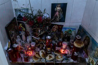 Su un mobile, un vibratore “per soffrire di meno” sul lavoro, e un piccolo altarino con Cristo, Madonnina e lumini accesi diligentemente ogni sera.
